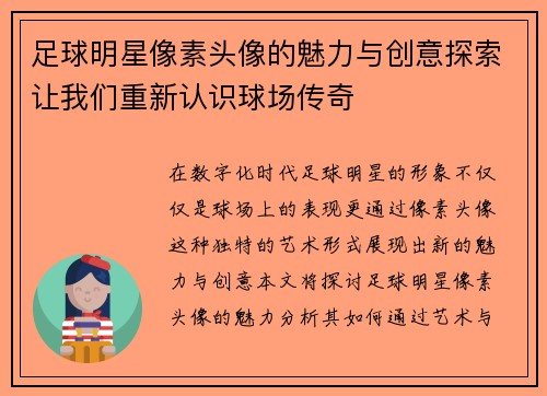 在全球范围内,足球被誉为“世界第一运动”,无数球迷为之疯狂。而球场上的传奇明星更是成为了各国球迷心中的偶像。本文将围绕“足球明星猜谜游戏大全”这一主题展开,带领读者通过趣味猜谜的方式,轻松识别那些在绿茵场上创造辉煌的足球传奇。我们将从四个方面深入探讨:一、足球明星的经典瞬间;二、猜谜游戏的规则与玩法;三、如何通过猜谜提高对足球知识的了解;四、推荐一些经典的足球明星及其故事。在这个过程中,我们不仅能...