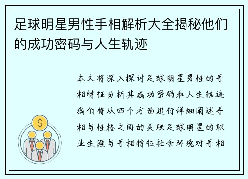 在全球足球的舞台上,顶级球员不仅以其卓越的技术和出色的表现赢得了无数荣誉,更通过他们背后的故事深深打动着球迷。本文将聚焦于外国足球明星,探索他们在赛场上的精彩瞬间以及那些鲜为人知的个人经历。从职业生涯的高光时刻到生活中的挑战与奋斗,文章将从四个方面详细阐述这些球员如何在竞技体育中展现自我,同时也揭示了他们作为公众人物所承担的责任与压力。我们将分析他们的成就、影响力、社交媒体上的形象以及慈善活动对社...